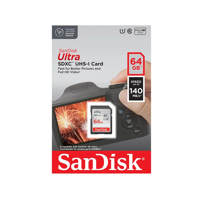 The SanDisk Ultra 64GB Class 10 SDXC UHS-I Memory Card (up to 140MB/s) is a reliable, high-speed storage solution perfect for capturing Full HD videos and photos with compact to mid-range cameras.